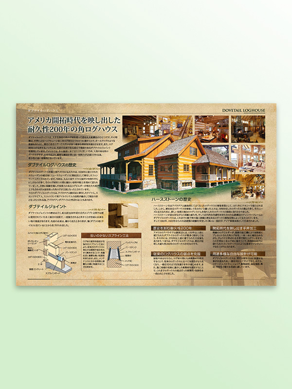 ログハウス建築を専門とした工務店様のカタログ。問い合わせが来た際にお送りする物カタログなので、これからこれが自分の家になるアンティーク感や日本建築ではない欧米感じられる作りにしました。