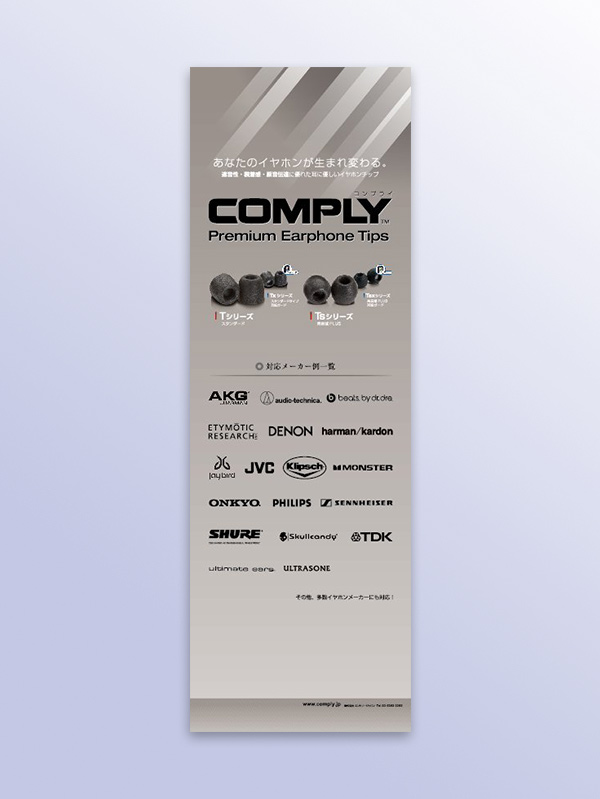 ポータブルオーディオ展示会用イヤーピースバナースタンド。専門展示会でしたのでお客様に説明する必要はあまりなく、とにかく様々なブランドに対応ができることをアピールすることを目的に作成しました。